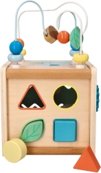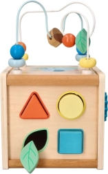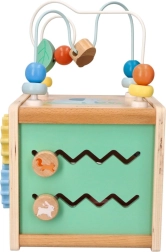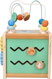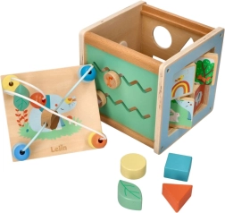 Deze hoogwaardige houten activitykubus van LELIN biedt aan elke zijde een afwisselende activiteit. Kleurige kralen op draden, labyrinten, vormen sorteren en tandwielen houden de aandacht vast en stimuleren op natuurlijke wijze vaardigheden, creativiteit en geduld.