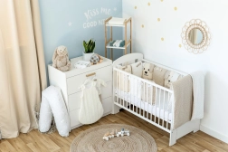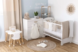De combinatie van beige en witte tinten met een modern design brengt een rustige en harmonieuze sfeer in de kinderkamer.