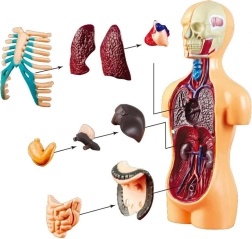 Dit gedetailleerd uitgewerkte anatomische torso-model maakt het mogelijk de ordening van menselijke organen aanschouwelijk te leren kennen. Dankzij de uitneembare onderdelen (longen, hart, lever, maag, alvleesklier, dunne en dikke darm, ribben) leert u eenvoudig hun positie en onderlinge samenhang.