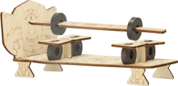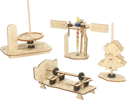 Laserprecies uitgesneden houten onderdelen passen in elkaar zonder lijm of gereedschap. Kinderen leren tijdens het bouwen de basis van mechanica, overbrengingen en balans.