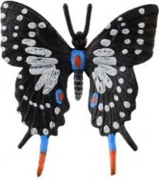Dit hoogwaardige vlindermodel toont de typische kenmerken van het geslacht Papilio – elegante zwarte vleugels met witte vlekken en subtiele blauwe en rode accenten. Dankzij de realistische afwerking is het een perfecte aanvulling voor natuurliefhebbers, scholen en musea.
