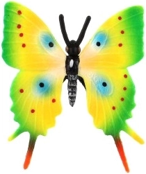 Decoratieve kunststof vlinder in de vorm van een koninginnepage in groen- en geeltinten met een lengte van 5,5 cm. Perfect als aanvulling op decoraties, scrapbooks en kinderspellen. De vleugels zijn gedetailleerd uitgewerkt met een opvallend patroon en ogen zeer realistisch. Ideaal voor decoraties, creatief knutselen, educatieve activiteiten en thema-arrangementen.