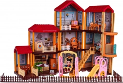 Dit ruime plastic huis in levendige kleuren biedt kinderen talloze mogelijkheden voor creatief spel. Het interieur omvat een keuken, badkamer, muziekkamer, woonkamer, slaapkamer, kleedkamer en dagkamer. Rondom het huis staat een hek met een buitenzone met zitje, parasol en speeltuin met glijbaan en schommel.