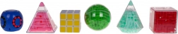 Een kubus met 3D-doolhof, twee piramides met een knikker, een bolvormig doolhof, een knikkerbal en een RUBIK-kubus – gevarieerde uitdagingen voor uren slimme pret.