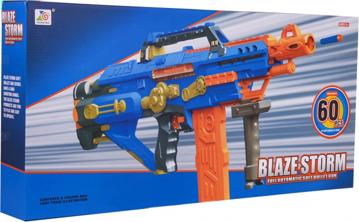 Beleef actieve fun met de automatische blaster BLAZE STORM in het blauw. Deze kindvriendelijke karabijn met een hoogcapaciteitsmagazijn en foamkogels schiet tot ca. 15 m ver. Eenvoudige bediening, ergonomische greep, stabiliserende bipod en veilige zachte darts voor zorgeloos speelplezier binnen en buiten.