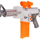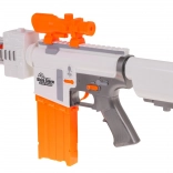 De blaster is gemaakt van hoogwaardig plastic en ligt prettig in de hand. Het schietbereik is ongeveer 15 meter, ideaal voor gevechten binnen en buiten. De voeding wordt geleverd door 5× AA 1,5 V-batterijen (niet inbegrepen).