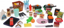 . | - grote keuken, .- bord, .- krijtbord, .- spons, .- pan met deksel, .- koekenpan met deksel, .- mand, .- kom, .- 2 x mok, .- theepot, .- zoutstrooier, .- 2 x kruidenpotje, .- peperstrooier, .- sojasaus, .- hete saus, .- zoetzure saus, - ketchup, .- 2 x jam, .- 2 x sandwich, .- 2 x bord, .- 1 x schaal, .- komkommer, 5 paprikaschijfjes, banaan, 2 wortelschijfjes, wortel, 2 slablaadjes, 2 x erwtjes, 2 uienringen, 2 broccoliroosjes, maïs, aardappel, peer, .- lepel, vork, mes, .- soeplepel, schuimspaan, spatel, pastalepel, hakmes, .- afwasmiddel, .- kartonnen pakjes melk, sap, koekjes, hamburgers, hamburgers, .- stickervel. |