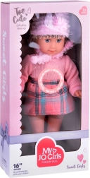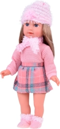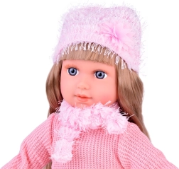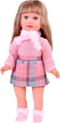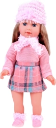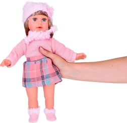 We presenteren u de prachtige pop Kate, die kinderen Engels leert. Deze stijlvolle pop is gekleed in een roze trui, een minirok met een ruitpatroon, sokken, een sjaal en een hoed met decoratieve elementen. De hoogte van de pop is ongeveer 42 cm.< /p>