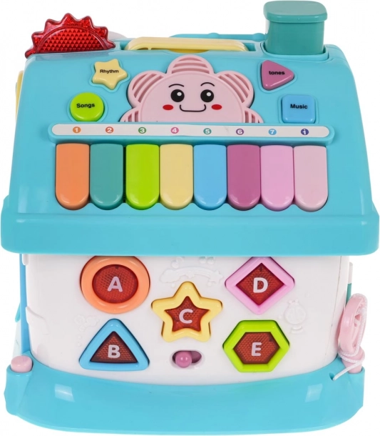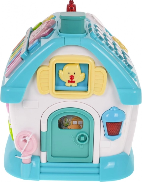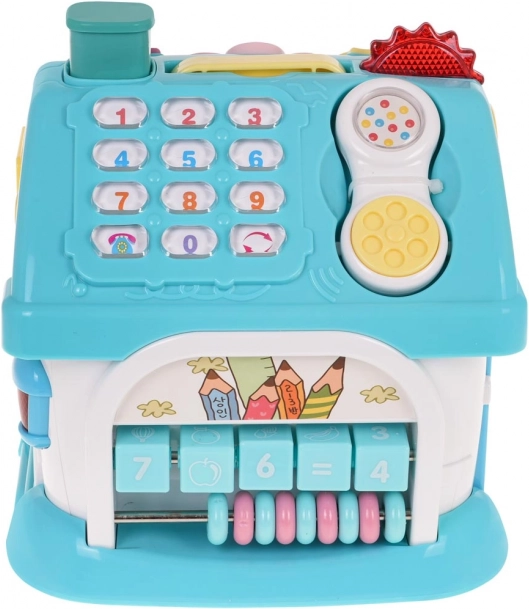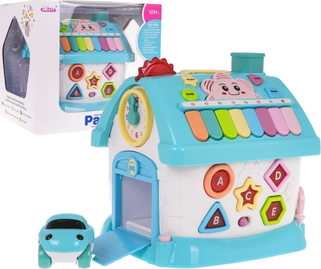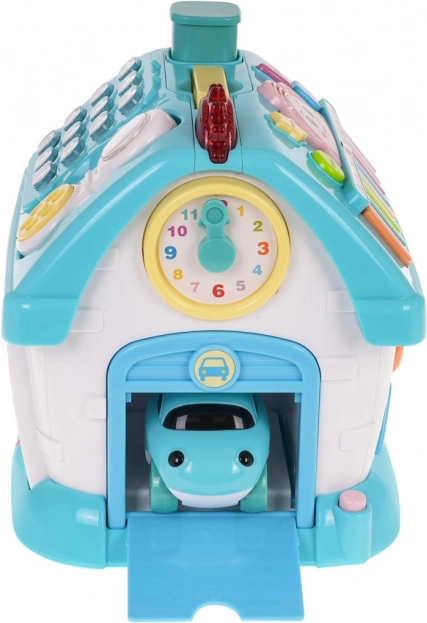 Het interactieve huisje is gemaakt van kwalitatief kunststof in aantrekkelijke kleuren en is ontworpen om kinderen op een speelse manier vormen, letters en cijfers te laten ontdekken. Elke van de vier zijden biedt andere activiteiten – van een klok met echt beweegbare wijzers en garagedeuren, via een wand met alfabet en verlichte vormen, tot voordeuren met sleutel met licht en geluiden. Er is ook een klein autootje inbegrepen voor nog meer speelscenario’s.