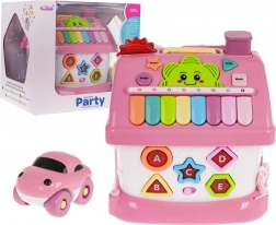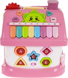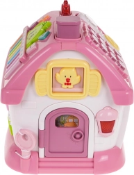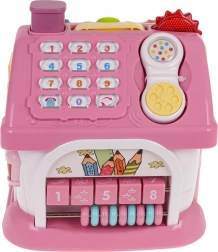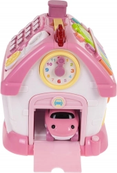 Onder het dak bevinden zich een uitneembare telefoon, een numeriek toetsenbord en een piano met acht gekleurde toetsen, waarop kinderen melodieën kunnen spelen en tonen en ritmes kunnen veranderen. De voorkant biedt een deur die opengaat met deurgeluid en lampje; de zijkanten bevatten het alfabet A–E met Engelse uitspraak en namen van vormen, draaielementen en een garage met een uitschuifbaar roze autootje.