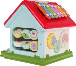Het dak verbergt een xylofoon voor de eerste muzikale stapjes en een vormsorter met 6 gekleurde blokjes. Kinderen oefenen fijne motoriek, oog-handcoördinatie en logisch denken. De robuuste afwerking van kwaliteitsplastic in levendige kleuren trekt meteen de aandacht en dankzij het inklapbare handvat neem je het huisje gemakkelijk mee.