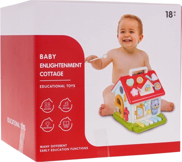 Ontdek een leuke manier om kinderen kennis te laten maken met muziek, vormen en kleuren. Het interactieve huisje combineert een pianootje met 5 toetsen (cijfers, dieren en hun geluiden, melodieën, tonen Do–So), een lichtgevend raampje en sprekende/spelende elementen met diertjes. Elke wand biedt een andere activiteit – van een deurtje met sleutel tot tandwielen en draaiende blokken met letters.