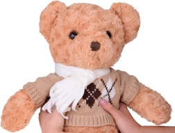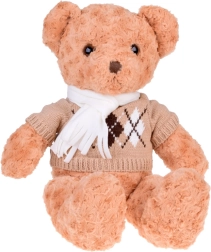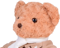 De teddybeer is gehuld in een stijlvolle elegante trui en crèmekleurige sjaal, wat hem charme geeft en hem klaarstoomt voor winteravonturen. Hij is de perfecte speelkameraad en zal een trouwe vriend worden voor kinderen en volwassenen. Het is het perfecte cadeau voor elke gelegenheid!