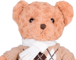 De trui met argyle patroon en de crèmekleurige sjaal van de teddybeer geven het speeltje een modieus uiterlijk. Deze accessoires verhogen niet alleen de esthetische waarde, maar benadrukken ook zijn elegantie.