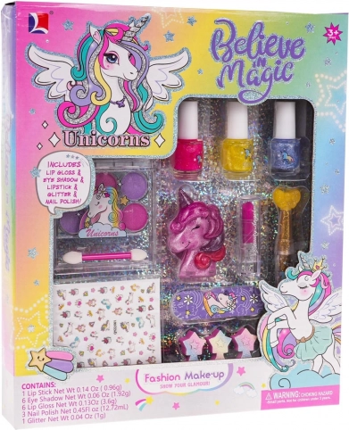 Een betoverende nagel- en make-upset met een eenhoornthema die elke kleine diva vanaf 3 jaar zal verrassen. Bevat glitter nagellakken, oogschaduw met kwastje, lipgloss in een doosje in de vorm van een eenhoorn, nagelstickers, een vijl, vingerspreider, glitterapplicator en een lippenstift. Alle cosmetische producten zijn kindveilig en makkelijk afwasbaar.