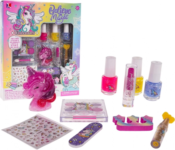 Inhoud van de verpakking: 3× glitter nagellak, lippenstift, glitterapplicator, nagelvijl met eenhoorn, vingerspreider, oogschaduwpalette (6 kleuren) met kwastje, lipgloss in een doosje in de vorm van een eenhoorn, decoratieve nagelstickers.