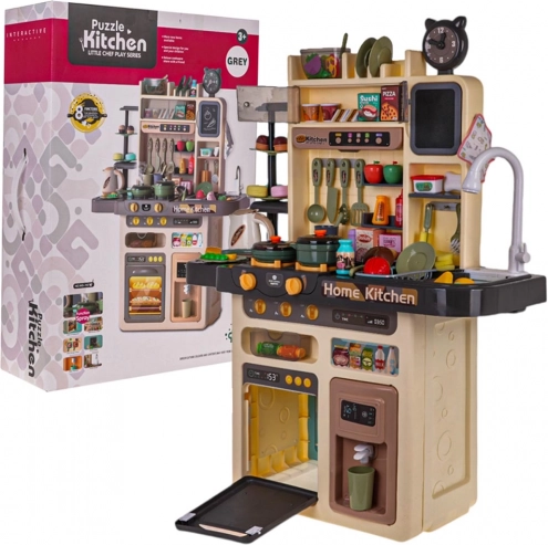 Deze ruime kinderkeuken tovert de kamer om tot een kleine culinaire werkplaats. Kinderen genieten van realistische elementen zoals verlichte kookplaten met bak- en kookgeluiden, stoom uit een van de branders en een kraan met stromend water. Open de oven, berg etenswaren op in de koelkast met waterdispenser, draai aan de bedieningsknoppen en zet de afzuigkap met muziekpaneel aan.