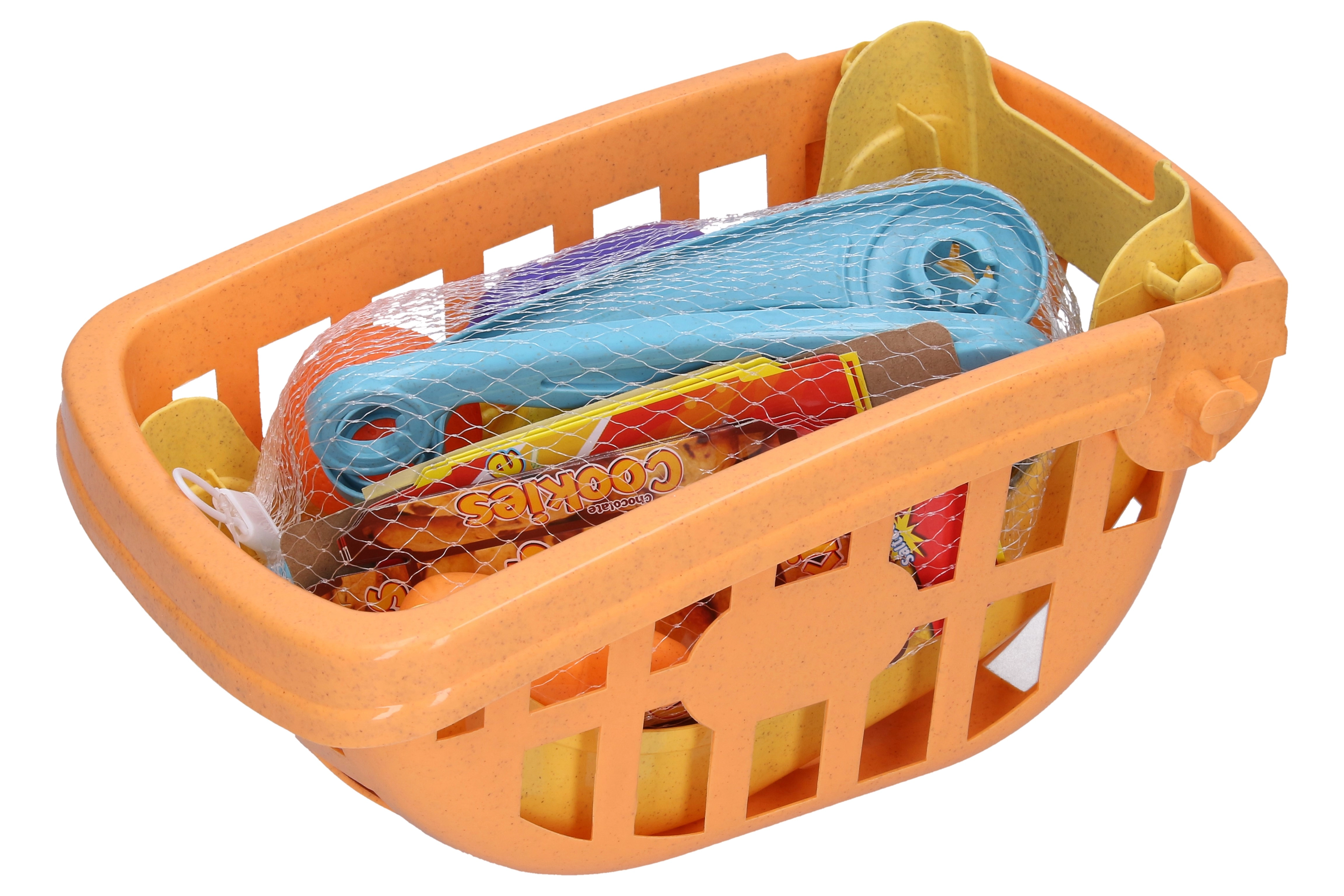 De set bevat een mand/wagentje en een gevarieerde selectie etenswaren – fruit, groenten, sap, chips en koekjes. Kinderen oefenen het benoemen van voedingsmiddelen, sorteren en eenvoudig tellen. Het compacte formaat van 41,5 cm zorgt ervoor dat het wagentje ook in kleinere ruimtes past.