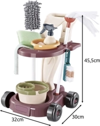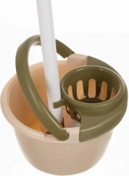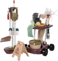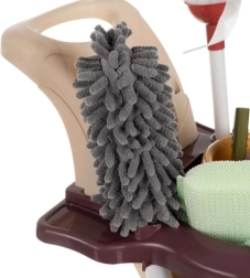 • Kar met ergonomische handgreep - Een kar op vier brede wielen, gemaakt van hoogwaardig PP-kunststof, ontworpen voor gemakkelijk manoeuvreren. De ergonomische brede handgreep helpt kinderen de kar te sturen, ook tijdens spel onderweg. Op twee legplanken kunnen verschillende onderdelen van de set worden geplaatst: de emmer met wringzeef voor de mop op de onderste plank en de kom, mat, wringer en zeepschaaltje op de bovenste plank. Dankzij speciale openingen kunnen de ronde plumeau, spons en mop in de kar worden geplaatst, wat gemakkelijke toegang tot alle hulpmiddelen mogelijk maakt. Aan de zijkanten van de kar zitten twee haakjes om de microvezeldoek op te hangen.