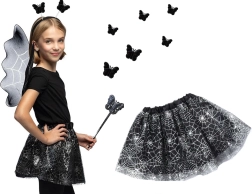 Dit Halloweenkostuum voor kinderen combineert een betoverende look met comfort. De zwarte tulerok met zilveren spinnenwebprint glinstert prachtig, de lichte vleugels met elastiek zijn eenvoudig aan te trekken en de haarband met vlinders op veertjes voegt een speels accent toe aan het geheel. Alles is gemaakt van licht polyester dat niet belemmert in de beweging.