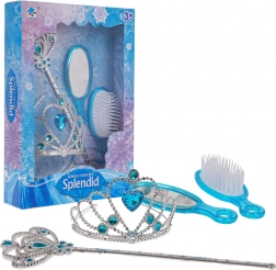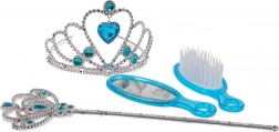 Laat de kinderlijke verbeelding stralen met deze elegante set voor kleine prinsessen in blauw. De tiara en staf met glinsterende steentjes geven elke verkleedoutfit een koninklijke touch, terwijl het spiegeltje en de borstel zorgen voor de perfecte look van elke kleine koningin.