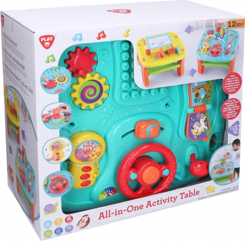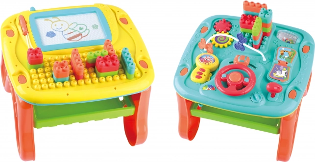 Het dubbelzijdige activiteitentafeltje van 37 cm combineert spelen en leren in één. De bovenkant met stuur, versnellingspook en rammelaars stimuleert de fijne motoriek en zintuiglijke waarneming, terwijl de onderkant met magnetisch tekenbord en bouwplaat de creativiteit en verbeelding bevordert.