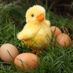 Zacht materiaal en gedetailleerde afwerking geven het kuiken een levendige uitstraling – ideaal om mee te knuffelen en als decoratie.
