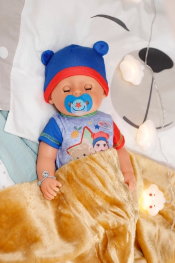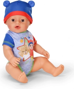Maak kennis met Jonas! De pop Jonas, bekend uit de animatieserie BABY born die je in het Tsjechisch kunt bekijken op het BABY born-kanaal op YouTube, kun je nu ook thuis hebben. In een nieuwe outfit en met 10 accessoires. Hij brengt een magisch bordje mee: wanneer je een beetje water op het bord met het witte plaatje giet, verschijnt er een heerlijk maaltje met een schattig gezichtje, waardoor het voeden van de pop nog leuker wordt. Als je Jonas na het voeren (met water) of na het drinken uit het flesje op het potje zet en op zijn buikje drukt, verschijnt er op het plaatje in het potje een afbeelding van plassen en poepen. Wanneer Jonas water uit het flesje drinkt, kan hij tranen huilen en moet hij getroost worden. De magische speen kan helpen: draai je hem in zijn mondje 180 graden, dan gaan zijn oogjes open of dicht. Draai nog een keer en het omgekeerde gebeurt. Jonas kan nog meer: hij heeft beweeglijke gewrichten en je kunt hem ook in bad doen. Nu droogt hij zelfs sneller dan ooit: om de pop na het spelen goed schoon te maken, kun je één beentje verwijderen zodat er een grotere opening ontstaat om de pop te reinigen. Zo kan het water makkelijker uit de pop wegstromen. Voor nog boeiender spel neemt Jonas naast het flesje, de speen, het bordje met het plaatje van eten en het potje met het plaatje van plassen en poepen ook een luier, een geboorteakte, een stickervel en twee vriendschapsarmbandjes mee – één voor de pop en één voor haar kleine mama – als bewijs van een langdurige en liefdevolle vriendschap tussen het kind en de pop.