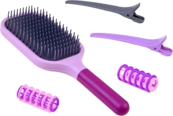 Verdeel lokken met klemmen, kam het haar door met de borstel en vorm het met de rollers – eenvoudige en veilige tools voor kleine handjes.