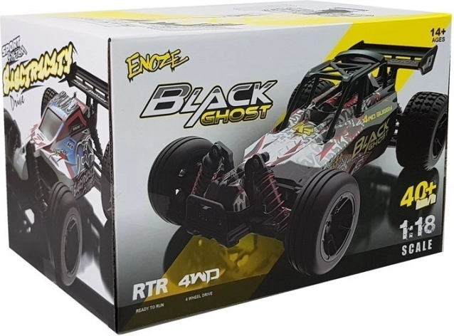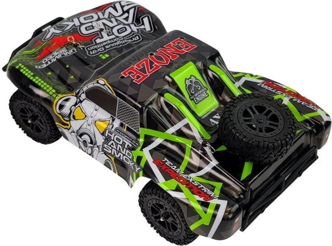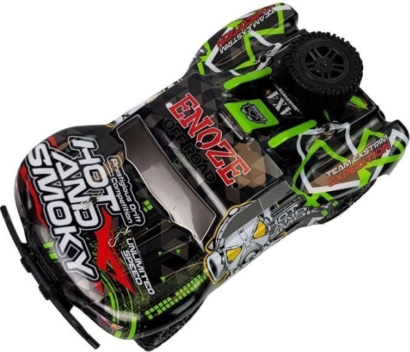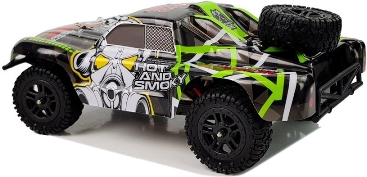 Snelle RC terreinwagen op schaal 1:18 met vierwielaandrijving, snelheid tot 40 km/u en onafhankelijke wielophanging voor soepel rijden in terrein. De ergonomische 2,4 GHz afstandsbediening zorgt voor nauwkeurige besturing tot 50 m. Duurzame constructie en een grote Li‑ion accu 7,4 V 850 mAh voor rijplezier op elk oppervlak.