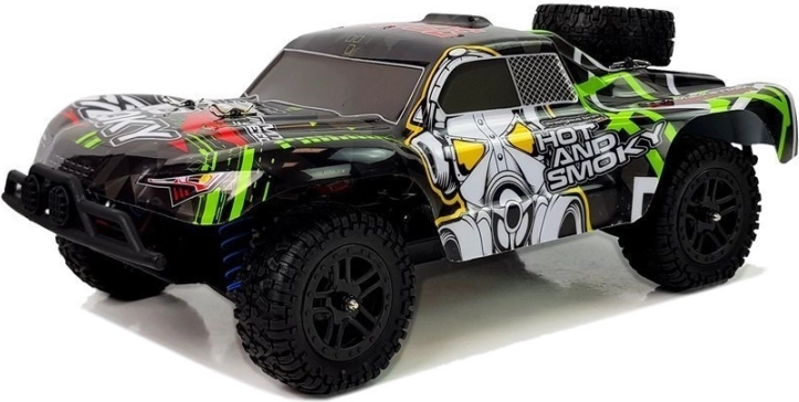 De set is RTR – Ready To Run: in de doos vind je de auto, een 2,4 GHz pistoolzender, een accu 7,4 V 850 mAh en een lader. Het besturingsbereik is ongeveer 50 meter, de rijtijd circa 15 minuten en het opladen duurt ongeveer 3 uur. Robuuste materialen (metalen en kunststof onderdelen, elektronica, rubber) verhogen de schokbestendigheid.