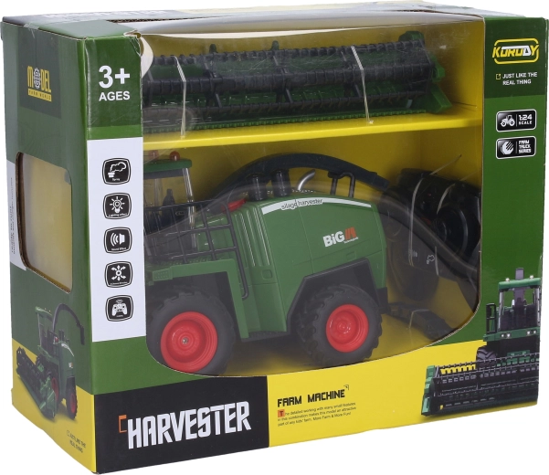 De maaidorser heeft een AAN/UIT-schakelaar aan de onderkant, evenals de afstandsbediening. De linkerknop op de afstandsbediening activeert licht- en geluidseffecten en de rechterknop activeert rookeffecten. Voor eenvoudige montage en gebruik vindt u een afbeeldingsinstructie aan de onderkant van de verpakking.
