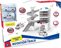 Deze set bevat een meerlagige draaiende helling met een metalen ambulanceauto, wat zorgt voor een interactieve speelervaring.