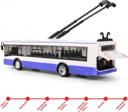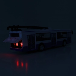 De bediening is eenvoudig en leuk: open de deuren handmatig, sluit ze met de knop op het dak en kijk hoe tijdens het sluiten de koplampen knipperen. De trolleybus rijdt met een terugtrekmotor, dus hij vertrekt makkelijk over de vloer. LR44/AG13-batterijen zijn al inbegrepen, dus je kunt meteen na het uitpakken van start.