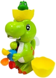 De groene dinosaurus heeft ook een kleintje, waarmee je kindje ook in het water kan spelen. De kleurrijke molen zorgt bij elk badmoment voor plezier. Je hoeft alleen water te scheppen en het vervolgens in de halve schaal op de kop van de dinosaurus te gieten. Het water stroomt uit de bek van de dinosaurus en loopt daarna over de gekleurde wieltjes, waardoor ze gaan draaien.