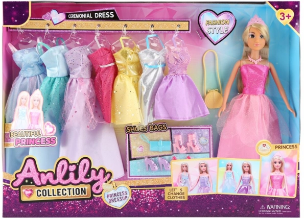Deze pop is de perfecte metgezel voor kinderen vanaf drie jaar. Haar realistische proporties en eenvoudige hantering stellen kinderen in staat om verschillende modieuze stijlen te creëren met behulp van zeven vervangende jurken, drie paar schoenen, een handtas en een kroon. Kwalitatieve materialen garanderen duurzaamheid en een lange levensduur van het speelgoed.