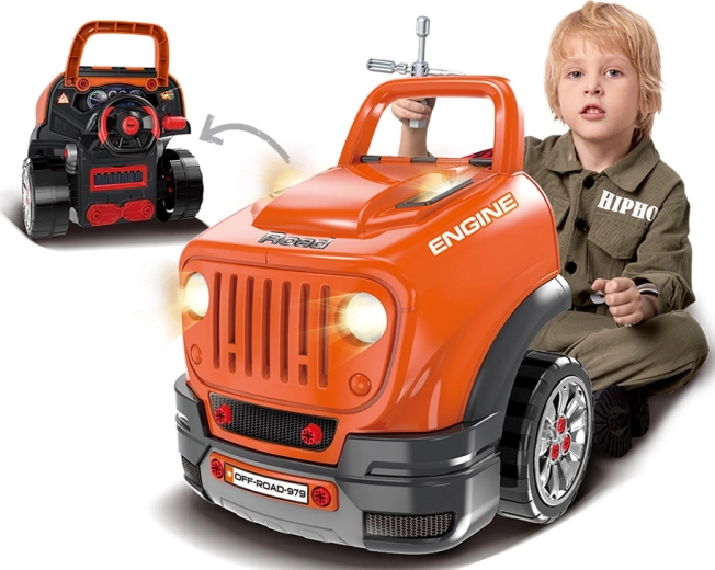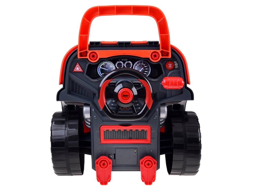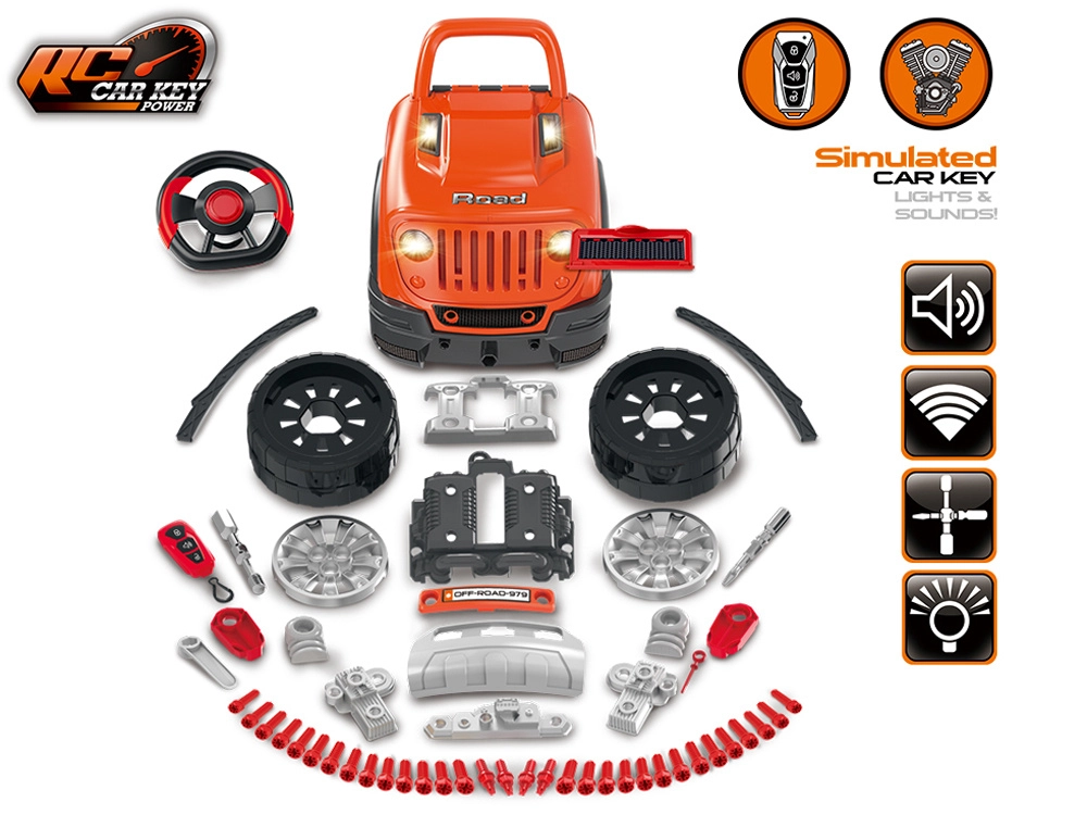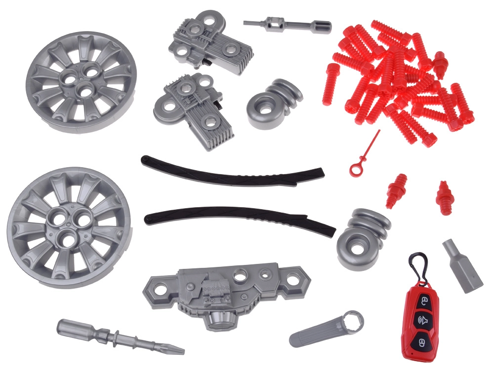 Inclusief rijk assortiment accessoires: bouten, schroevendraaier met inbussleutel, 4-in-1 gereedschap, oliepeilstok en filter, kentekenplaat en steunen om de auto te “heffen”. Het draaibare stuur met werkende claxon en versnellingspook zorgt voor extra plezier.