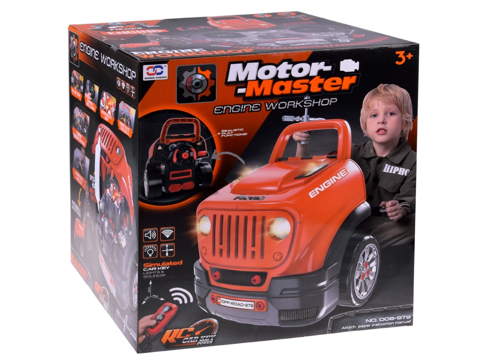De interactieve werkplaatsset voor kleine monteurs simuleert het werk in een autogarage op realistische wijze. Kinderen kunnen de motorkap openen, de uitneembare motor uit elkaar halen en weer opbouwen, wielen en wieldoppen wisselen, starten met een knop proberen en geluids- en lichteffecten gebruiken – van claxon en achteruitrijden tot alarm en waarschuwingslichten.