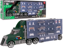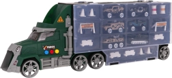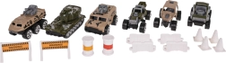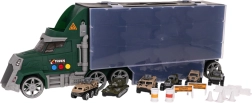 De set bevat 6 metalen/veer-gelagerde autootjes van het type “pullback-resorák” en een rijk assortiment accessoires (pylonen, hekjes, barrières, vaten) voor het bouwen van eigen hindernisbanen en militaire scènes. Het praktische draaghandvat maakt het voor het kind makkelijk om de vrachtwagen overal mee naartoe te nemen.