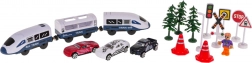 Rails, station, brug, trein, 4× verkeersbord, stoplicht, lamp, 3× boompje, 2× pylon, 2× spoorboom, 3× autootje, figuurtje