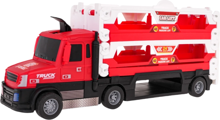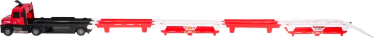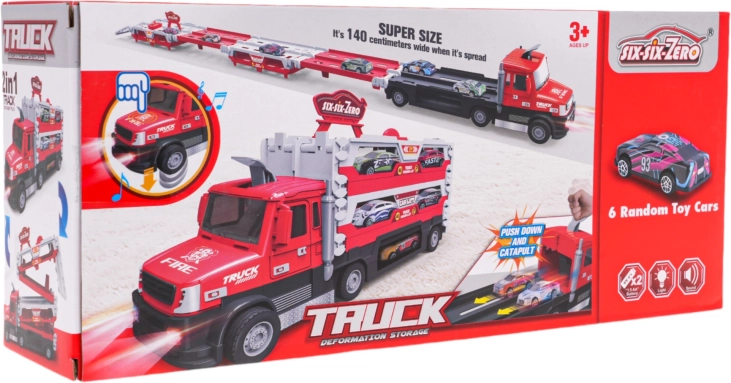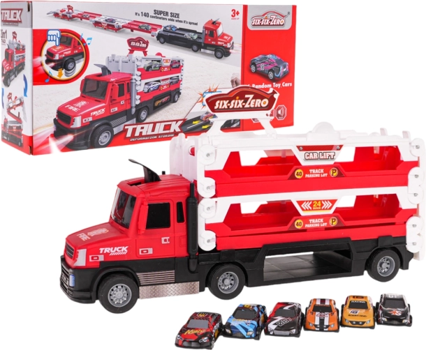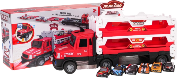 Door op het voorste deel van de vrachtwagen te drukken, worden motor- en remgeluiden en knipperende koplampen geactiveerd, voor een extra realistische speelervaring. In de verpakking vind je meteen 6 metalen autootjes, zodat je direct na het uitpakken kunt racen.