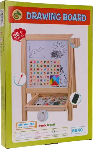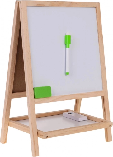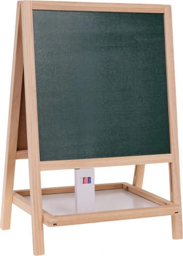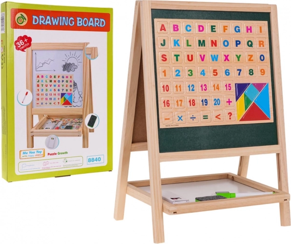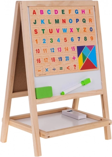 Houten dubbelzijdig bord voor kinderen vanaf 3 jaar. Eén zijde is wit voor tekenen met stift, de andere zijde is zwart voor tekenen met krijt. Het bord is aan beide kanten magnetisch en bevat letters, cijfers en geometrische vormen als magneten.