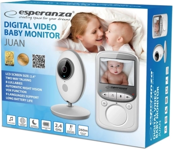 De elektronische babyfoon Esperanza JUAN met 2,4″ LCD stelt je in staat je baby voortdurend in de gaten te houden terwijl je vrij door het huis kunt bewegen. Hij biedt nachtzicht, tweerichtingsintercom, VOX voor energiebesparing, kamertemperatuurmeting en bereik tot 260 m. Daarnaast heeft hij 8 slaapliedjes en een lange batterijduur tot 20 uur.