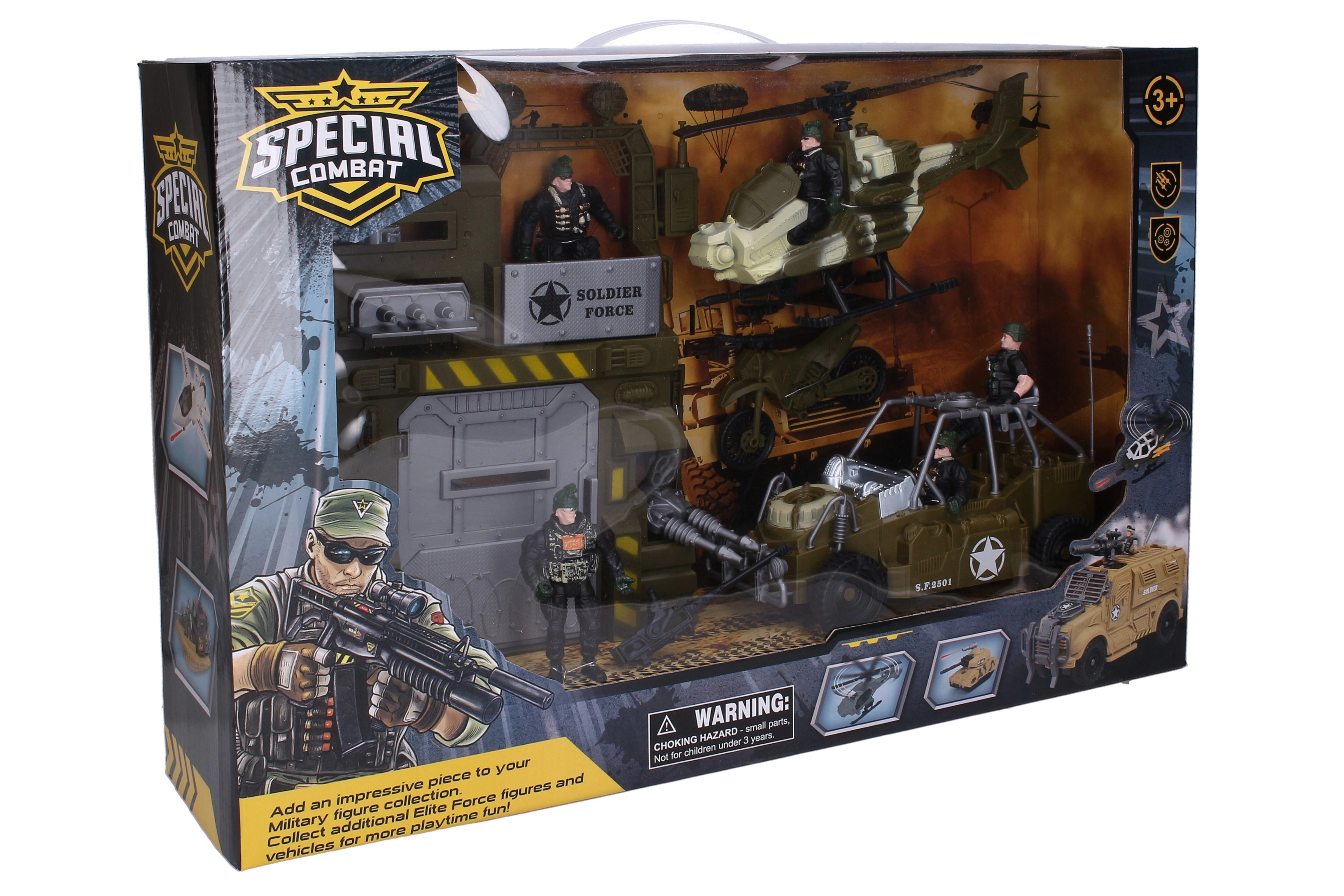 - Complete uitrusting: auto, helikopter, motor, 5 soldaten, wapens en accessoires