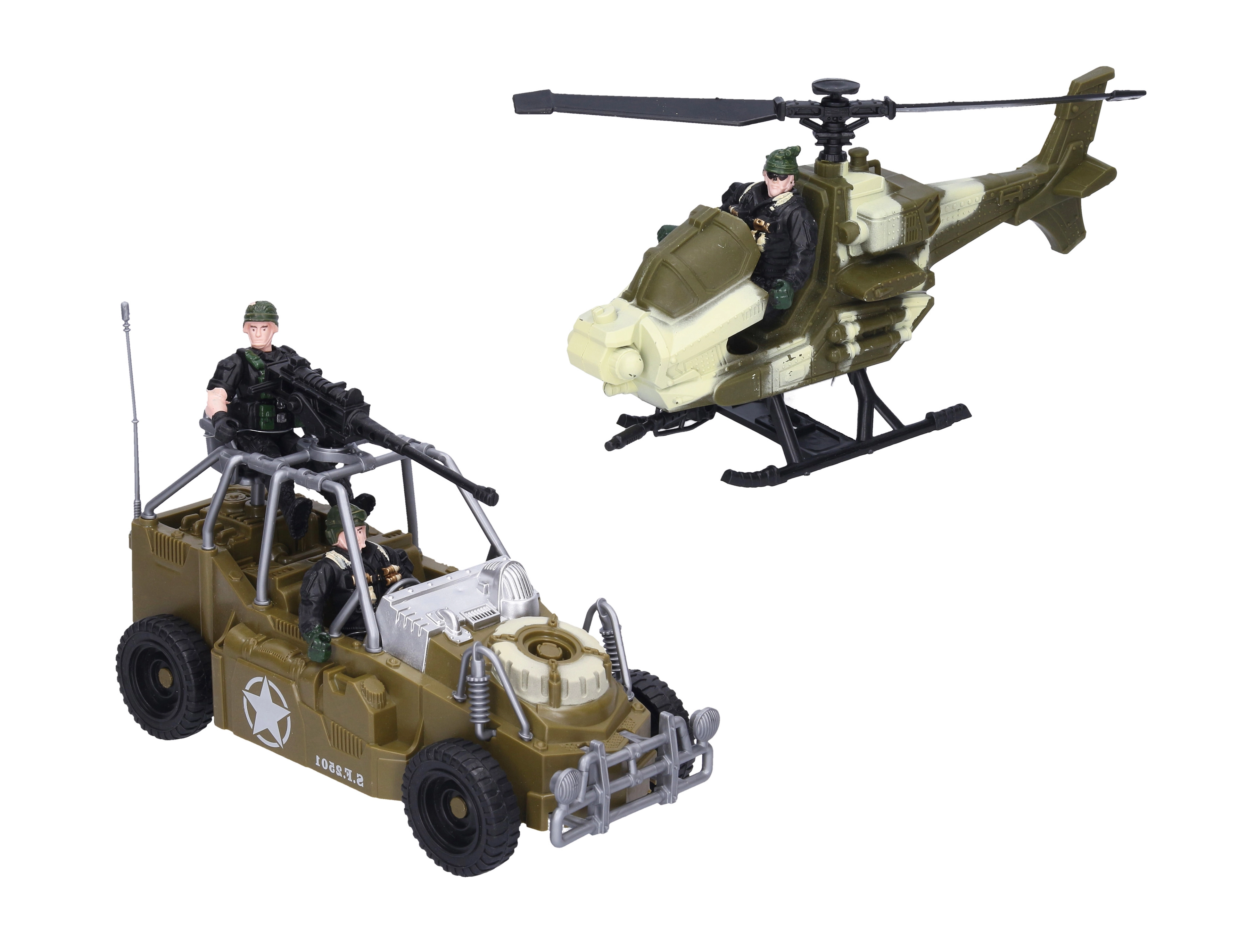 - Auto, helikopter, motor, 5 soldatenfiguren, wapens en accessoires