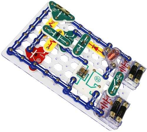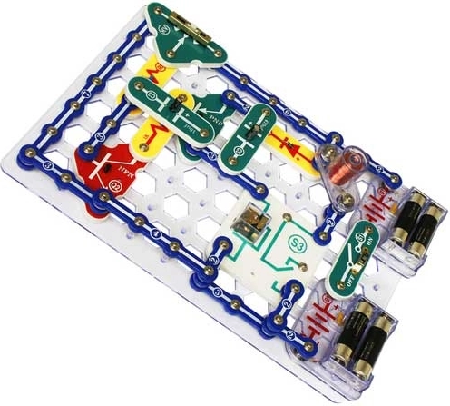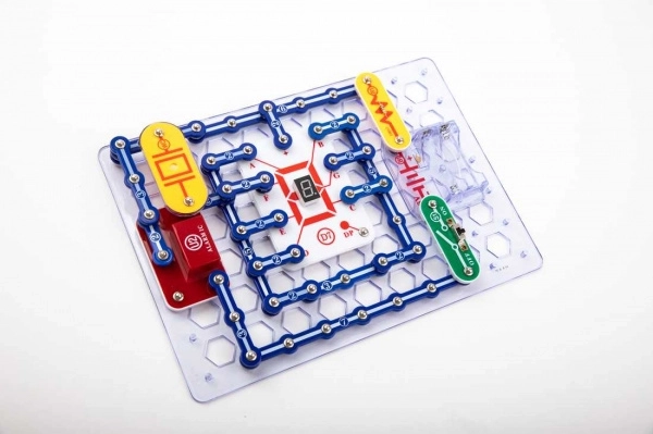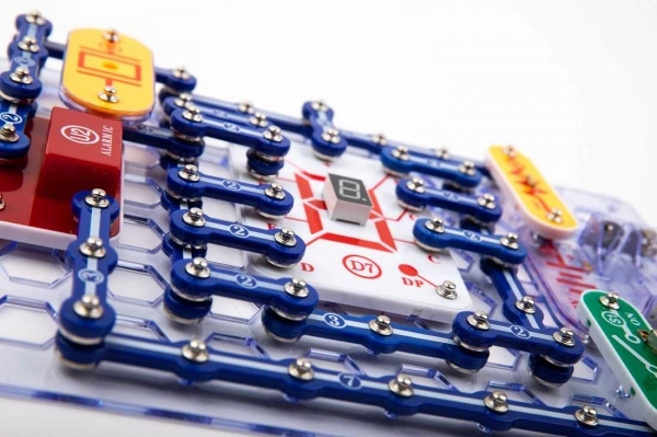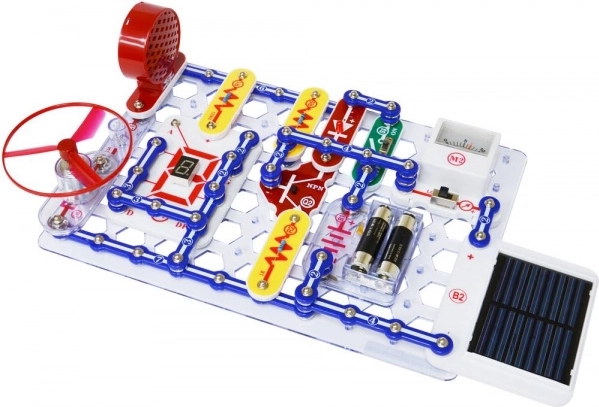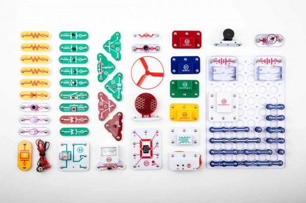 Onderdelen worden met snapcontacten op de basisplaat bevestigd. Kleuraanduidingen en componentlabels maken de oriëntatie makkelijk, ook voor kinderen vanaf 8 jaar.