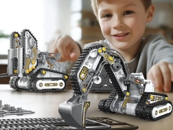 Uit één set bouw je een tank, harvester, heftruck en rupsgraafmachine – elk model heeft bewegende onderdelen en is klaar voor afstandsbediening.