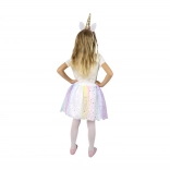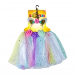 Verander je kind in een magische eenhoorn met dit kleurrijke kostuum, bestaande uit een tutu-rokje en een eenhoorn-haarband. Deze set is ideaal voor kinderen die willen genieten van sprookjesachtige avonturen tijdens het spelen. De rok is versierd met gekleurde tule met sterrendecor en is dankzij de elastische taille gemakkelijk aan te passen.