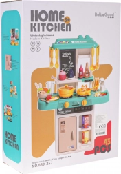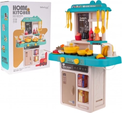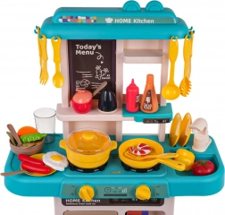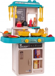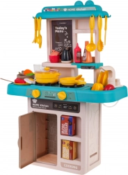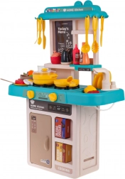 Deze kinderkeuken in trendy blauw–turquoise tinten tovert de kamer om tot een klein bistro. De interactieve kookplaat geeft bij het draaien aan de knoppen kook- en bakgeluiden en verlicht de branders. Uit de kraan stroomt echt water, zodat kinderen na het “koken” het servies kunnen afspoelen zoals in een echte keuken.
