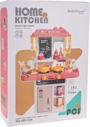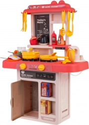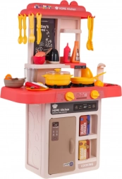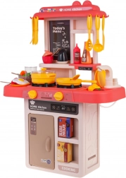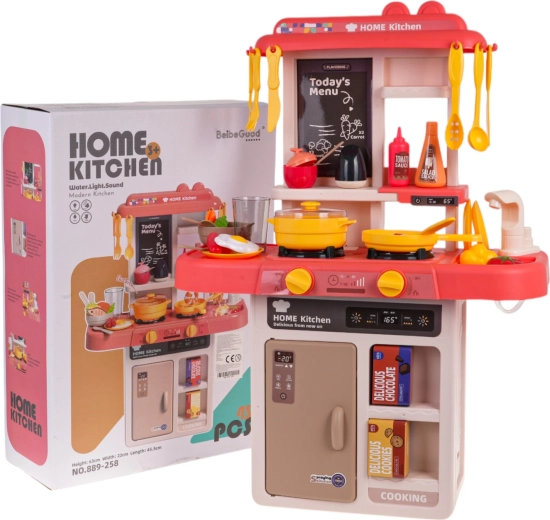 Deze interactieve keuken in levendige kleuren zal elk kind enthousiast maken. Dankzij de verlichte kookpitten en realistische kook- en bakgeluiden is het spel maximaal boeiend. De werkende kraan met water maakt afspoelen van vaat mogelijk zoals in een echte keuken, terwijl de “koelkast” met plankjes geopend kan worden voor het opbergen van voedsel.